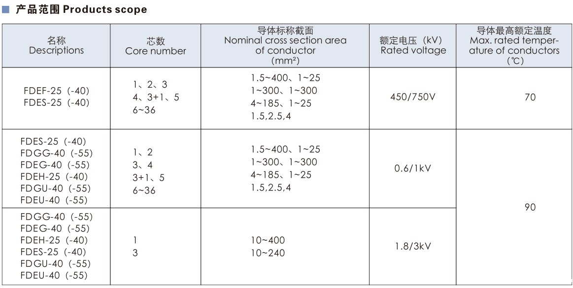 2、电缆最高工作温度:450V/750V-70℃,0.6/1kV-90℃,1.8/3kV-90℃。